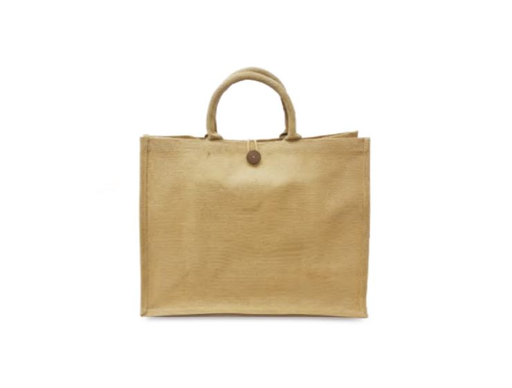 Natural coloured jute bag with an attractive wooden lock button. These shopping bags are great for promoting a business or store. Size: 430 x 330 x 190 mm