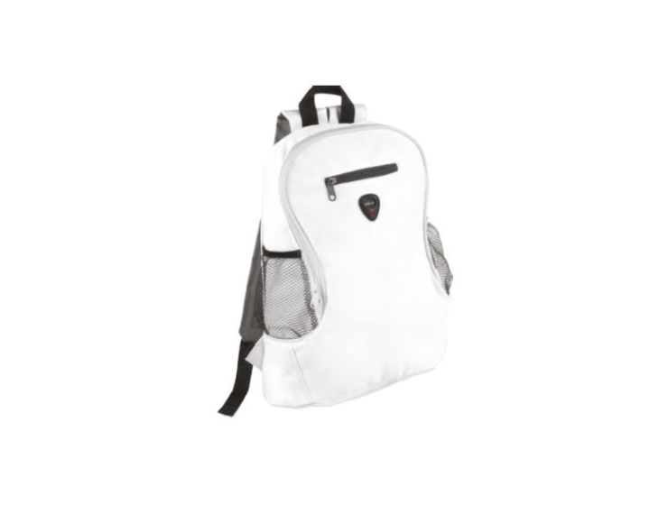 Polyester backpack with zipper closure and front pockets. with back and padded shoulder straps, mesh pockets on sides, Padded compartment up to 15″ laptops or tablets. SKU: SB-02 Dimension: 340 x 420 mm Printing: