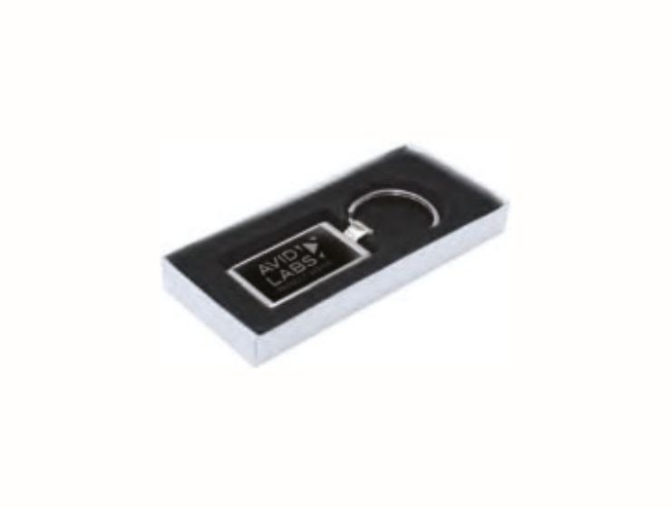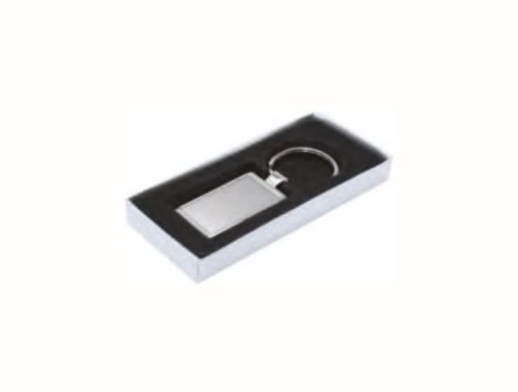 Silver Rectangular Metal Keychain. 2 side printing area. SKU: 23 Size: 50 x 32 mm Printing: Digital Printing with Epoxy, Laser Markings