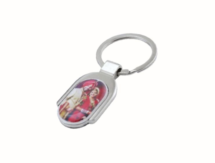 Oval Shaped Metal Keychain. 1 side printing area. SKU: 20 Size: 50 x 28 mm Printing: Digital Printing with Epoxy, Laser Markings