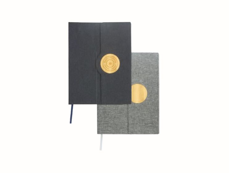 A5 Size RPET fabric hard cover notebook with round bamboo trims and magnetic closure. 80 sheets – 70gsm cream ruled paper. Dimension: A5(160 x 210 x 18 mm)