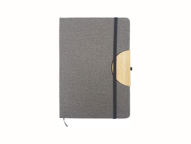 Fabric Cover Notebook with a touch of Bamboo material, Cover has a function of folding the front part to be used as a mobile stand. Has a Elastic band and a pen holder. Dimension: A5(140 x 210 x 17 mm)