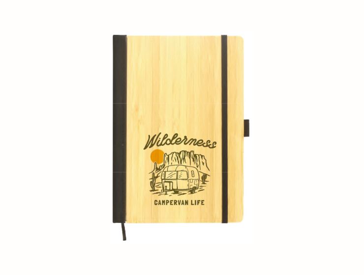 A5 Size Bamboo Notebook, 3mm natural bamboo front cover and black PU cover on back. 80 sheets – 70g kraft ruled paper with pen loop and ribbon page marker. Dimension: A5(140 x 210 x 17 mm)