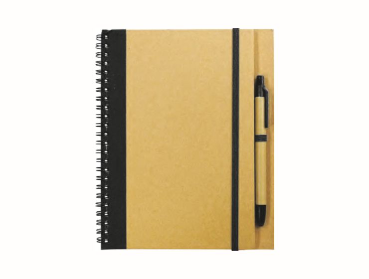 ECO Friendly Notebook with Pen holder. Made from hardboard with a colored stripe. Dimension: A5(140 x 210 x 20 mm)