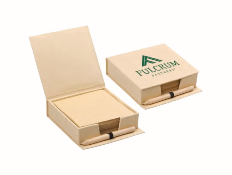 Flap box that contains sheets of pad made from recycled material. Pencil in natural color body. Dimension: 150 x 210 x 25 mm