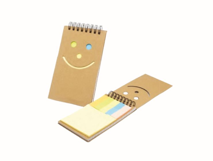 Spiral Recycled notepad in cardboard covers with smiley cut out, showing a first layer with a sticky 2 types of note & below is the second layer with a 50 sheet notepad in striped format. Dimension: 82 x 145 mm