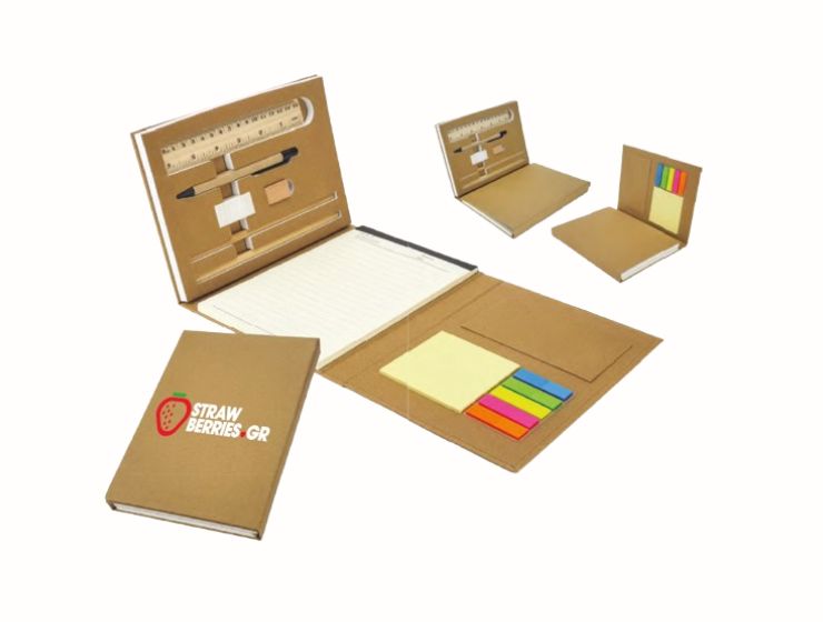 Tri-fold writing set with strap closure. Notepad in the center, pocket & sticky notes on the right panel. Pen, ruler, pencils, sharpener and eraser on left panel. Dimension: 150 x 210 x 25 mm